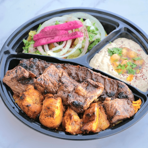 A mix of Chicken Shawarma and Falafel served with long-grain Basmati rice. It comes with Tahini or Hummus (Your choice), and a Salad with mixed pickles and veggies.